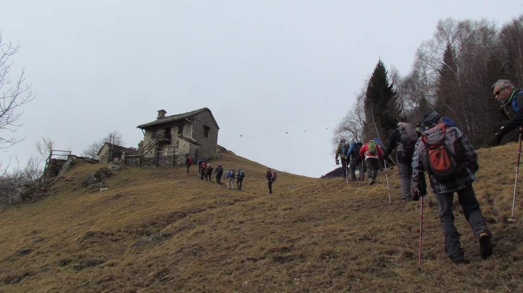 Camminiamo da un’ora e mezza e ci concediamo una pausa contemplativa. Di qui il sentiero sale ripido nel bosco di faggi e ci porta, in poco più di mezz’ora, sullo splendido balcone di Drocala, a quota 940, luogo ideale per una breve colazione. Intanto compaiono le prime nuvole e l’aria si rinfresca, ricordandoci che è ancora inverno e che i venticinque gradi dei giorni scorsi erano una pura illusione. Per fortuna! Poco sopra Drocala arriviamo in una radura, in prossimità dell’Alpe Prailer, dove troviamo una vecchia fontana. Qui i sentieri si dividono. Noi teniamo la sinistra (occidente), proseguendo fino all’Alpe La Barca, 1094, e l’Alpe Prer, 1150, la Cima Coppi del tour odierno.