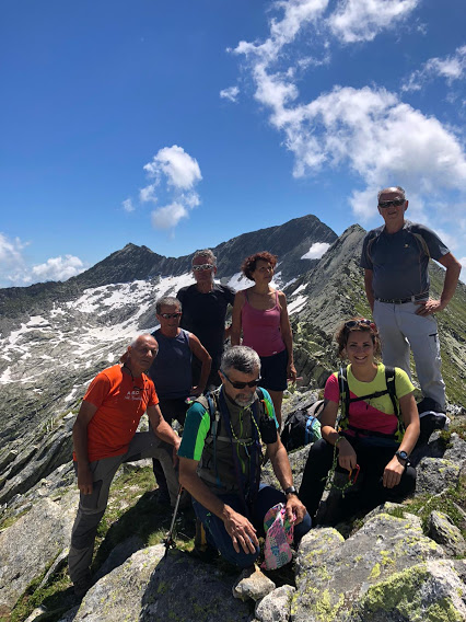 Nonostante un discreto recupero fisico, mi fermo ad attendere gli amici in zona sicura a quota 2550. Anche perché di qui ero già passato in gioventù, chiudendo il giro a Cheggio. L’età insegna anche a saper rinunciare e a distribuire equamente le scarse forze a disposizione. Gli altri proseguono per il passo, 2697, percorrendo con assoluta tranquillità, anche un’eroica esordiente, l’ultimo ripidissimo canale attrezzato. In contemplazione della splendida conca di Camposecco e dei suoi monti aspetto il gruppo e discendiamo al lago. Dopo una corposa pausa pranzo ripercorriamo in una lunga e faticosa discesa l’itinerario di salita. Chi in salita ha dato tutto paga lo sforzo in una soffertissima discesa, ma arriviamo comunque alle auto in tre ore. I medici del gruppo prescrivono immediatamente a chi ha sofferto di più una terapia rigenerante onde evitare il blocco totale degli arti inferiori nei prossimi giorni.