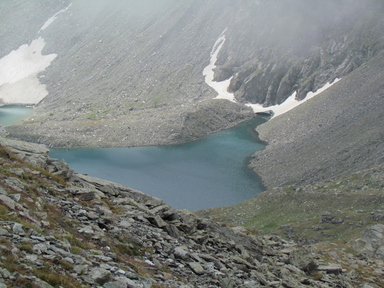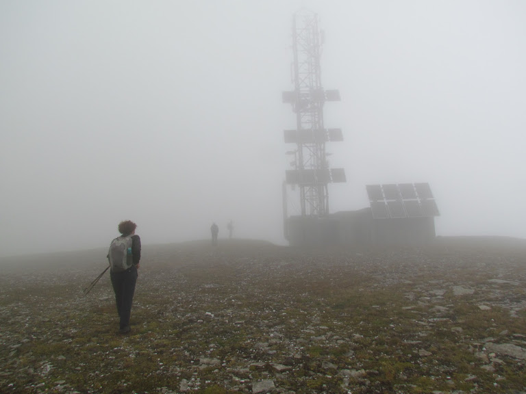 Ci concediamo una breve pausa e ripartiamo verso destra, attraversiamo il torrentello ed iniziamo a salire. Più in alto lasciamo alla nostra sinistra il lago più grande e più degno di tal nome. Gli altri due, ormai laghi solo sulle cartine, sono più in basso. A qualche sprazzo di sole si alterna la nebbia, anche abbastanza fitta, ma siamo ancora asciutti. Passiamo oltre un laghetto alla nostra destra e raggiungiamo il Passo di Sirwolte, 2621, dopo un’ora e un quarto. Solo con l’aiuto della buona conoscenza della zona, non certo della visibilità, torniamo verso oriente ed andiamo a prendere il sentiero che si trova sulla dorsale rivolta verso la Ritzitälli (che scende verso Engiloch). Prima ripido, poi in più dolce pendenza, questo ci porta in cima al Galehorn, 2797, in venti minuti. Il grande ripetitore di vetta è l’unica cosa che si intravvede.