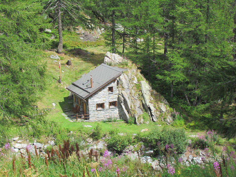 cendiamo ad attraversare il torrente e passiamo sulla sponda destra. Risaliamo alle baite di Chlusmatte e proseguiamo la morbida salita lungo il sentiero evidente e ben segnato, in mezzo al verde di rododendri e piccoli larici. Il passo tranquillo che devo tenere per sostituire degnamente la guida titolare mi dà tempo di pensare che qui, in inverno, con sci, zaino più pesante e neve spesso gelata, il pendio sembra molto più ripido. Raggiungiamo il primo ampio pianoro e ci troviamo di fronte la bellissima cascata che nasce dai laghi di Sirwolte. Lo strappo successivo, con l’aiuto ad un certo punto di alcuni gradini di ferro, conduce al disopra della cascata. Camminiamo da quasi un’ora e mezza.