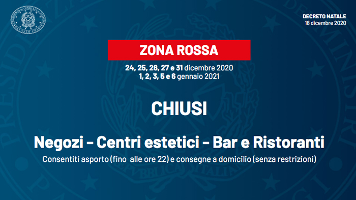 In particolare il 24, 25, 26, 27 e 31 dicembre 1, 2, 3, 5, 6 gennaio saranno giornate rosse per tutto il Paese, dove si potrà uscire di casa solo per ragioni di lavoro, necessità e salute.