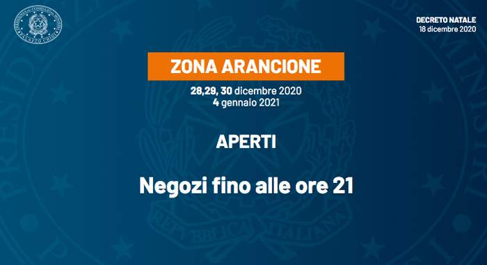I giorni feriali 28, 29, 30 dicembre e 4 e gennaio saranno invece zone arancioni. Saranno consentiti gli spostamenti all’interno del proprio Comune di residenza senza giustificazione e tra i Comuni con meno di 5 mila abitanti nel raggio di 30 km, esclusi i capoluoghi di Provincia.