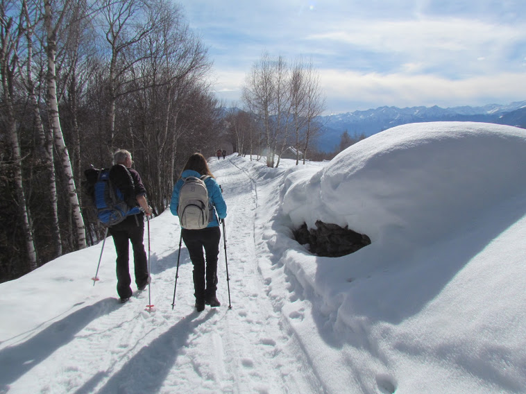 La strada entra nel bosco di faggi e arriviamo al bivio per Alagua, che si raggiungerebbe abbassandosi di oltre duecento metri. Noi teniamo la destra e saliamo all’Alpe Giovera di Sotto, 1521. Qualcuno prosegue fino a Giovera di Sopra, 1620, dove termina la strada. Da qui parte il bel sentiero che, in circa tre ore, porta al Lago di Matogno, ma sono cose da estate. A Giovera di Sotto spaliamo un po’ di neve per crearci la zona pranzo. Abbiamo camminato, con tutta calma, per circa tre ore.