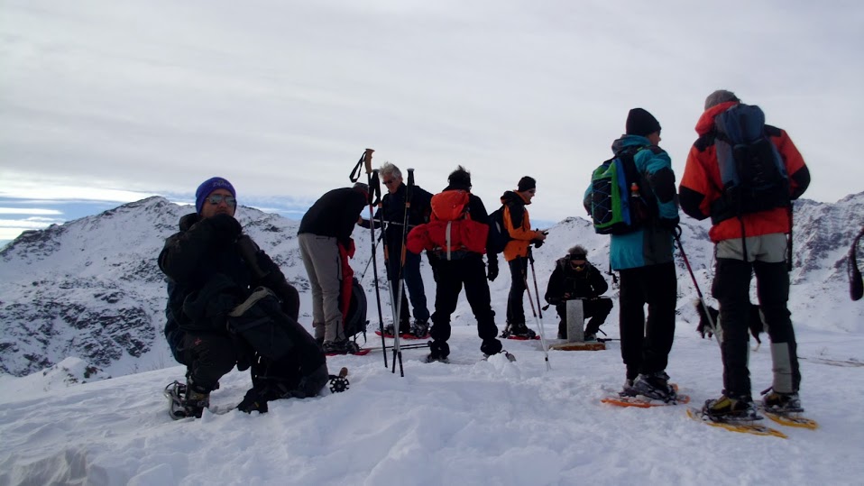 Risaliamo lungo i tornanti della strada e, prima del rifugio Il Dosso, bello ma oggi chiuso, tagliamo verso destra e raggiungiamo il rifugio dell'Alpe Paione, 1780. Poco più di tre quarti d'ora da San Bernardo e pausa colazione: ce la prendiamo veramente con calma. Torniamo sui nostri passi lungo la strada che ci porta a ricongiungerci con quella che sale al Passo di Monscera e in poco meno di un'ora siamo all'Alpe Monscera, 1978. Di qui in mezz'ora, dopo aver lasciato sulla nostra sinistra il pianoro dell'omonimo laghetto, arriviamo al Passo, 2103. E' ancora presto e si decide di risalire il pendio sulla nostra sinistra (sud – sud - ovest), finalmente un po' ripido, che ci porta sulla Cima Tirone, 2202. Qui la neve è dura ed apprezziamo le punte in acciaio sotto le ciaspole.