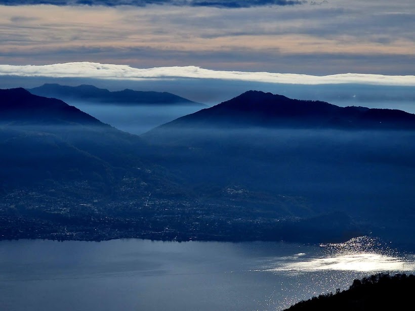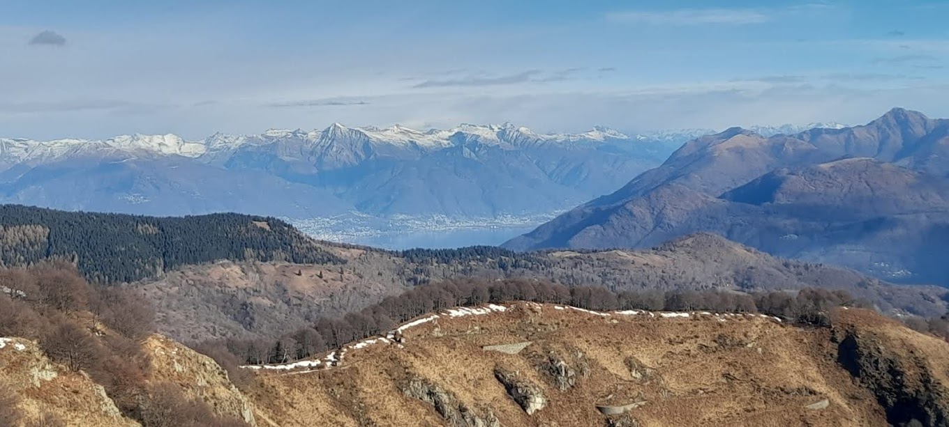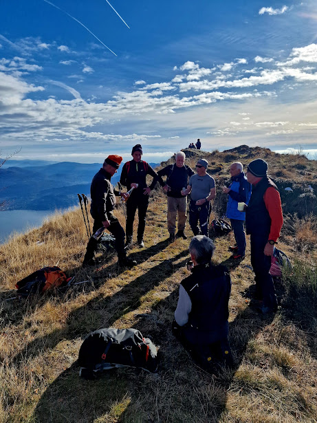 Prima del bivio per l’Alpe Morissolo ci fermiamo per una parca colazione, in previsione delle libagioni che ci attendono. Qui sale, non indicata, una traccia sulla sinistra, in mezzo alla vegetazione fortunatamente quasi invernale, su quella che sarebbe una bellissima mulattiera della Linea Cadorna. Un altro Paradiso perduto nel nostro territorio, ahimè! Sui cartelli indicatori qui si risparmia decisamente. Qualche tornante in mezzo alle felci ingiallite e, sulla dorsale, invertiamo decisamente la rotta verso ovest e poi sud. In dolce salita, pestando gli ultimi residui di neve, arriviamo in vetta al Monte Morissolino, 1410, dopo un’ora e tre quarti dal campo base di Calpera.