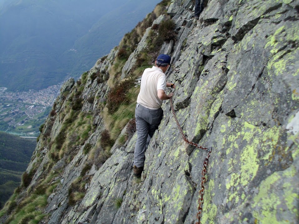 Alcuni escursionisti, nonostante la disapprovazione sacrosanta delle guide, abbandonano gli zaini lungo il percorso per ridurre la fatica. Penultima ripida salita sul pratone detto Pasquetta e qui lasciamo le racchette che ci intralcerebbero. Ripidissima discesa su sentiero un po' esposto, traverso attrezzato e ultima salita, sempre attrezzata. Siamo in vetta, 1574, dopo un’ora e tre quarti dalla Colma di Vercio. Pietose borracce di chi ha ancora lo zaino soccorrono chi ha le spalle colpevolmente scariche, ma che sia l'ultima volta! Panorama stupendo su laghi, Ossola, Val Grande ed altro.
