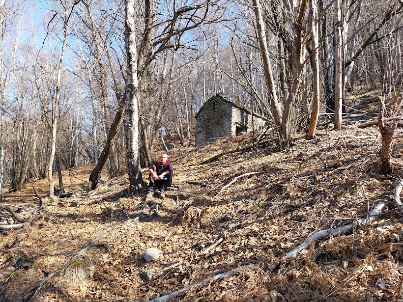 Tutti insieme percorriamo i quattro chilometri fino all’ampio parcheggio all’ingresso di Sant’Agata, 450, dove dieci anni fa c’erano dei bagni pubblici comodi e puliti che ci avevano illusi di essere in Svizzera, che in effetti dista pochissimo. Adesso, ahimè, sono chiusi. Dal paese parte il sentiero S06 che fa parte dell’AVG (Alta Via del Gridone). Lo seguiamo fino alla chiesetta di San Luca, 687, e, più oltre, fino al primo bivio. A destra si sale a Marcalone, da dove passeremo al ritorno. Noi teniamo la sinistra, sul sentiero S08a, e, con leggere pendenze, c’inoltriamo in Val Cannobina fino alle baite di Biessen, 864, litigando con rovi e ginestre.